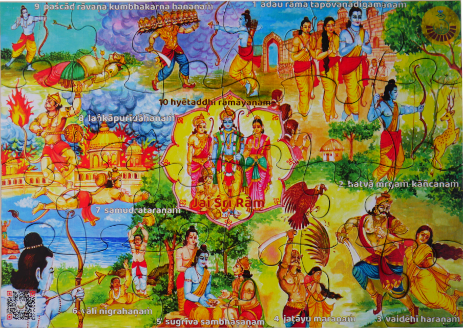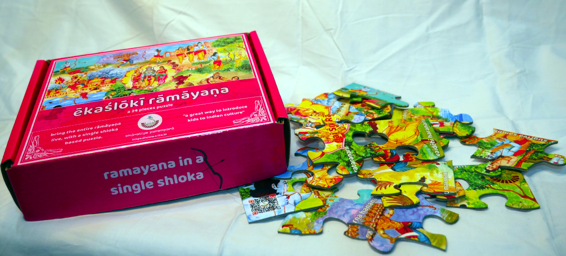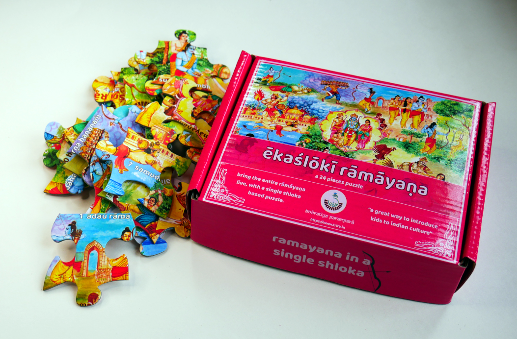 Ramayana has been told and retold in several different modes all through the history. Ekashloki Ramayana is one unique retelling that conveys the entire essence of Ramayana in a single shloka. The puzzle helps the young ones enjoy recreating the ramayana through a mindboggling rendering of the shloka as an artwork.